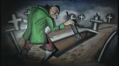 The Projectionist collects tales as little moral messages and his book-ending performance strangely echoes and counterpoints the content of the ANIMATED tale he chooses to project. Tonight, he decides to tell an old story the way it really happened – “the truth “ and what comes out is ‘The Devil’s Night Glass’.